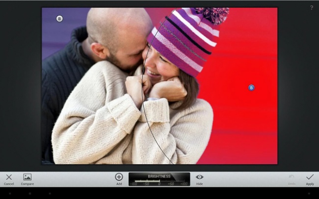 Приложение имеет очень удобный и практичный интерфейс. В нем воплотили все то, что необходимо для первичной коррекции снимков. Можно изменить яркость, насыщенность и контраст на отдельных участках изображения. Кстати, диаметр этих участков также настраивается.