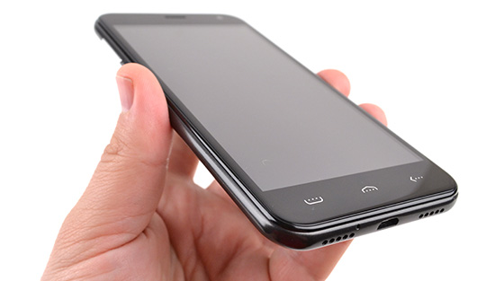 Всю переднюю поверхность смартфона занимает 2,5D стекло с скругленными гранями. Рамки вокруг экрана в глаза не бросаются. В нижней части экрана находятся три сенсорные кнопки без подсветки: «список запущенных приложений», «домой» и «назад».