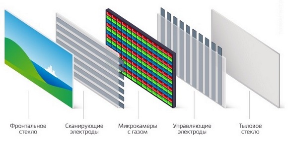 Плазменный экран представляет собой две стеклянные пластины, заполненные внутри газообразной смесью, подсветка которой и «активирует» пиксели на дисплее.