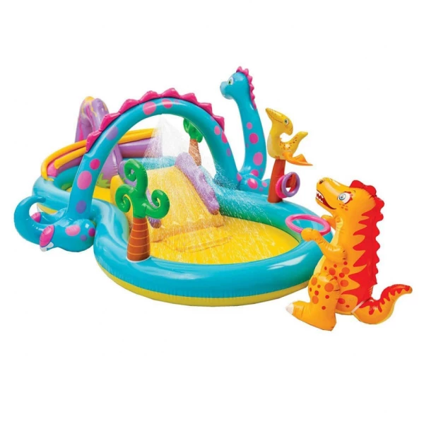 Игровой центр от Intex объединил в себе бассейн с горкой и игровой комплекс. Он изготовлен в стиле планеты динозавров, чем ещё сильнее привлекает детское внимание. Для работы этого центра достаточно подключить садовый шланг и наблюдать за тем, как резвится детвора. Игровой центр — это любимое место детей для проведения досуга в жаркий летний день. Они смогут пригласить своих друзей, чтобы вместе насладиться игрой в освежающем бассейне.