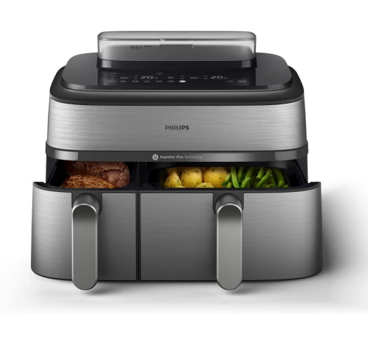 Мощная мультипечь премиального класса, которая открывает доступ к многочисленным полезным функциям. Модель Philips NA555/00 укомплектована двумя чашами. Общая вместительность — 9 л. Это помогает продуктивно использовать кухонный прибор, в частности, когда приходится угощать большую семью или компанию друзей. Вместе с функцией RapidAir предусмотрена опция приготовления паром Air Steam. Это обеспечивает равномерную и быструю термическую обработку даже без добавления масла.