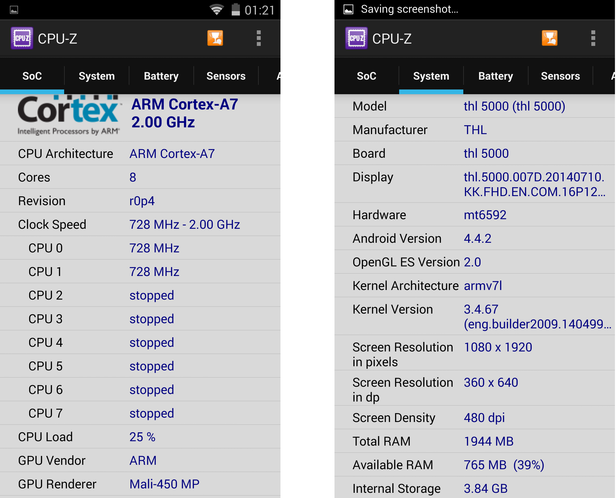 За производительность в смартфоне THL 5000 отвечает мощнейший восьмиядерный процессор компании MediaTek – MT6592, который основан на ARM Cortex-A7. Процессор работает на тактовой частоте 2.0 ГГц и построен по 28 нм техпроцессу. За обработку графики отвечает графический ускоритель ARM Mali-450MP4, работающий на тактовой частоте до 700 МГц.