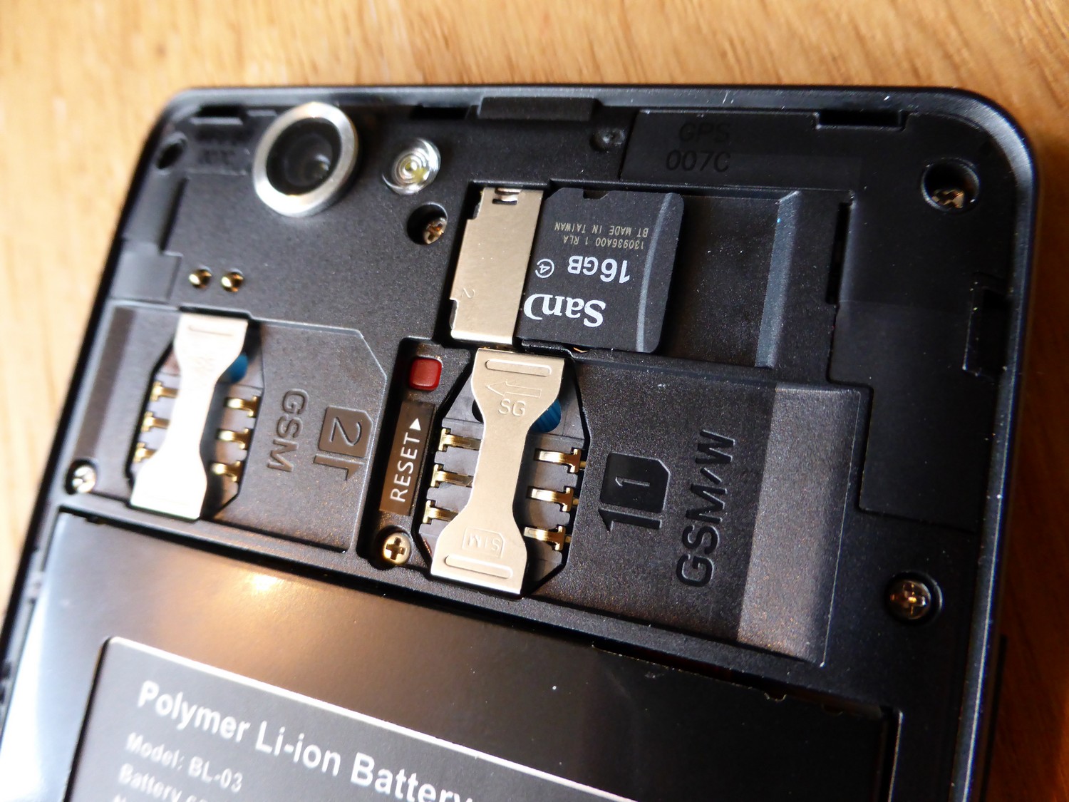 Под крышкой находится несъемный аккумулятор с огромной ёмкостью 5 000 мАч, контакты NFC-антенны, которая располагается на крышке, два разъема под SIM-карты обычного размера и слот для карты памяти формата MicroSD.
