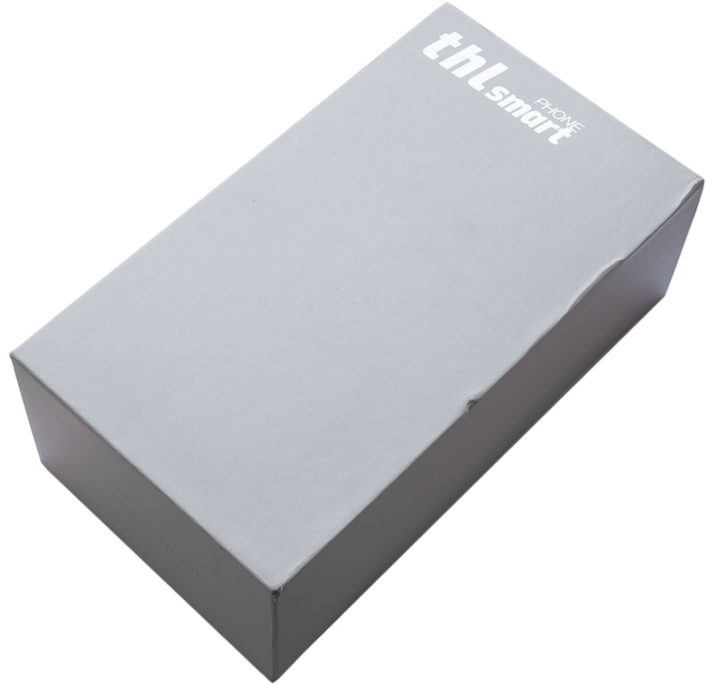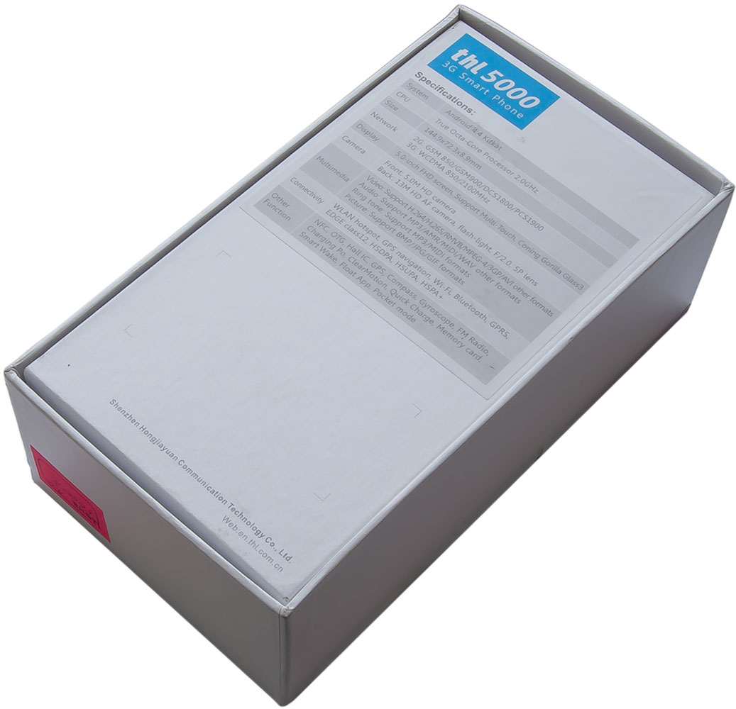 Смартфон THL 5000 поставляется в достаточно большой белой коробке из плотного картона, на нижней стороне коробки перечислены технические характеристики смартфона.