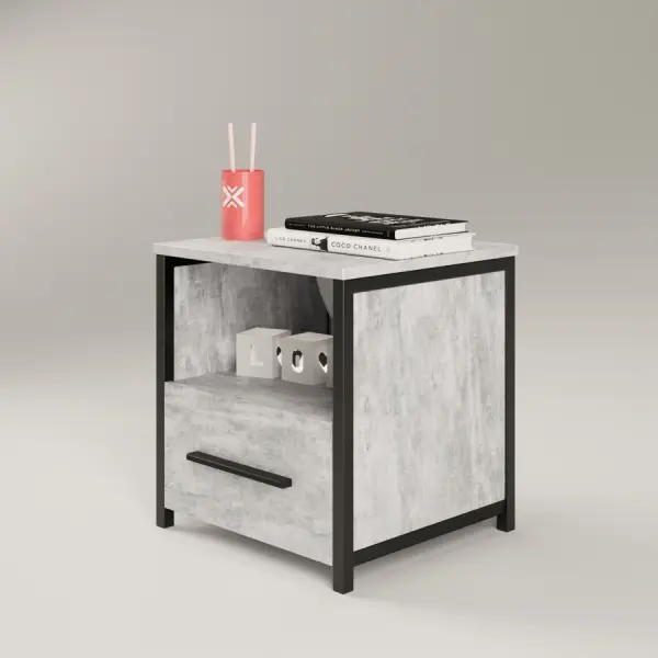 Компактна офісна тумба Fenster 06 виготовлена з якісних і міцних матеріалів, зокрема квадратної металевої труби покритою чорною порошковою фарбою і ДСП товщиною 16 мм. Вона оснащена висувним ящиком з використанням безшумних телескопічних направляючих, а також двома полками на яких можна зберігати документи, електроніку, канцелярське приладдя, свічки, аромадифузори та інші дрібнички.