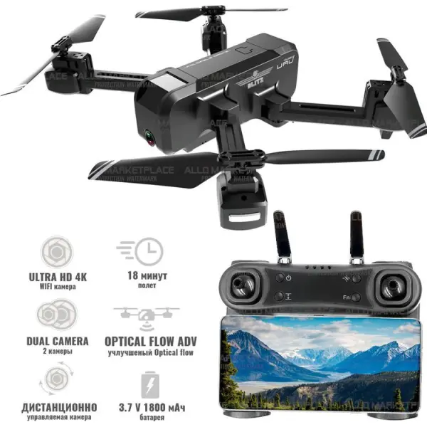 Ще один гідний варіант із категорії бюджетних моделей — квадрокоптер Blitz HS107 Ultra HD 4K + 720p. Високотехнологічний і складаний дрон робить фото з роздільною здатністю 4096×3072 крапок завдяки камері Ultra HD 4K. У ньому вбудований літій-полімерний акумулятор, який дозволяє апарату перебувати в польоті до 18 хвилин.