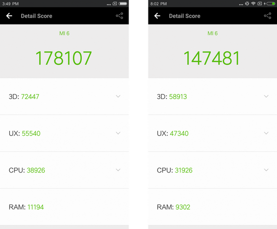 В Antutu гаджет набирает заоблачные 180 тысяч, приравниваясь к Samsung Galaxy S8, а тот действительно зверь. Производительность Xiaomi Mi6 только радует. Правда, смартфон немного греется при высоких нагрузках, а на следующих прогонах немного проседает, но все равно флагман крут.