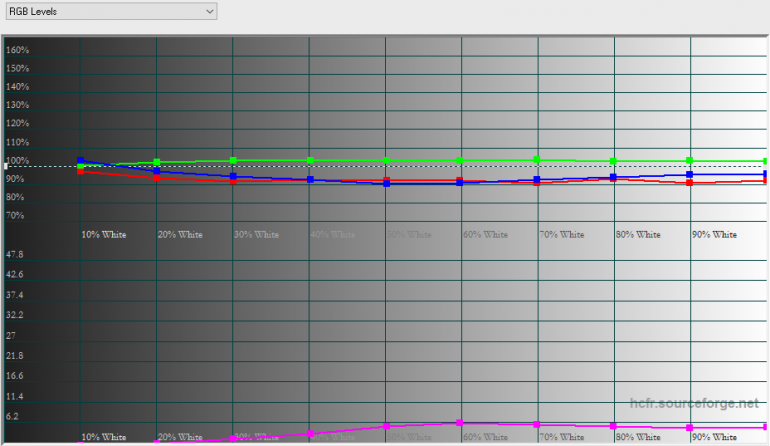 Что касается цветового охвата, он шире sRGB-пространства, а температура немного ниже нормы, вследствие чего изображение характеризуется желтовато-розоватыми подтонами.